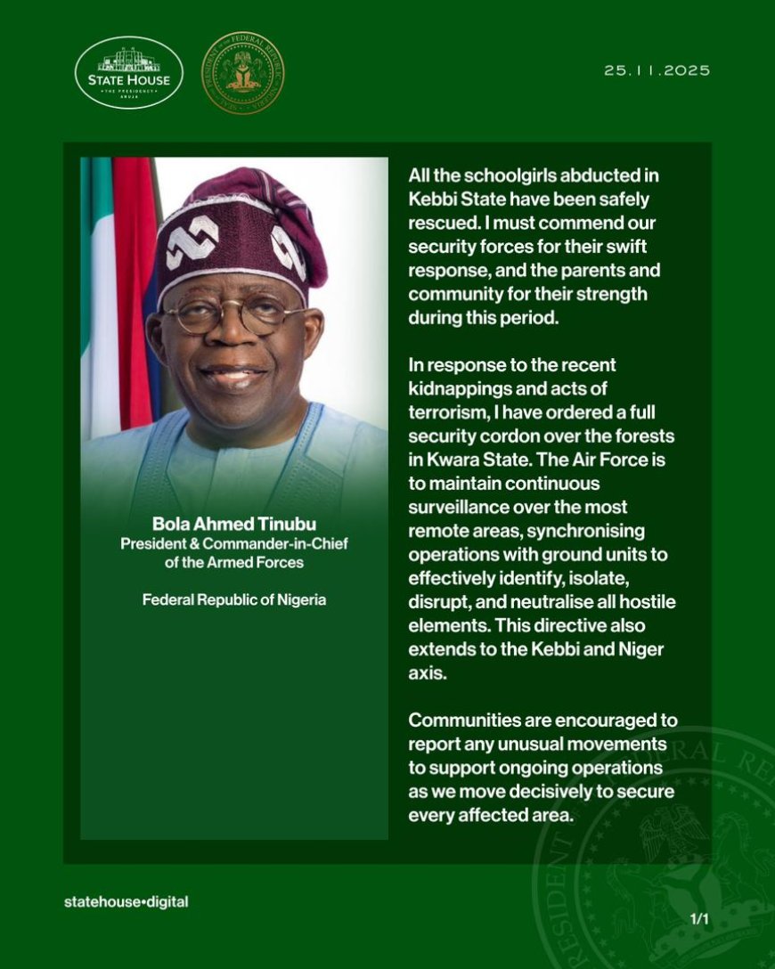 All 24 Kebbi Schoolgirls Rescued - Governor Denies Ransom Payment, Tinubu Orders Air Force Surveillance
