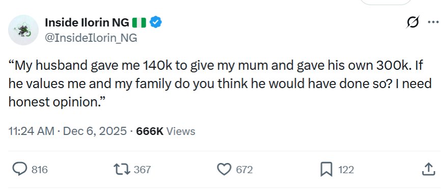 In a viral update shared by Inside Ilorin on X (formerly Twitter), the woman narrated that her husband gave her ₦140,000 to pass on to her mother shortly after gifting his own mother ₦300,000 for what was believed to be routine upkeep.